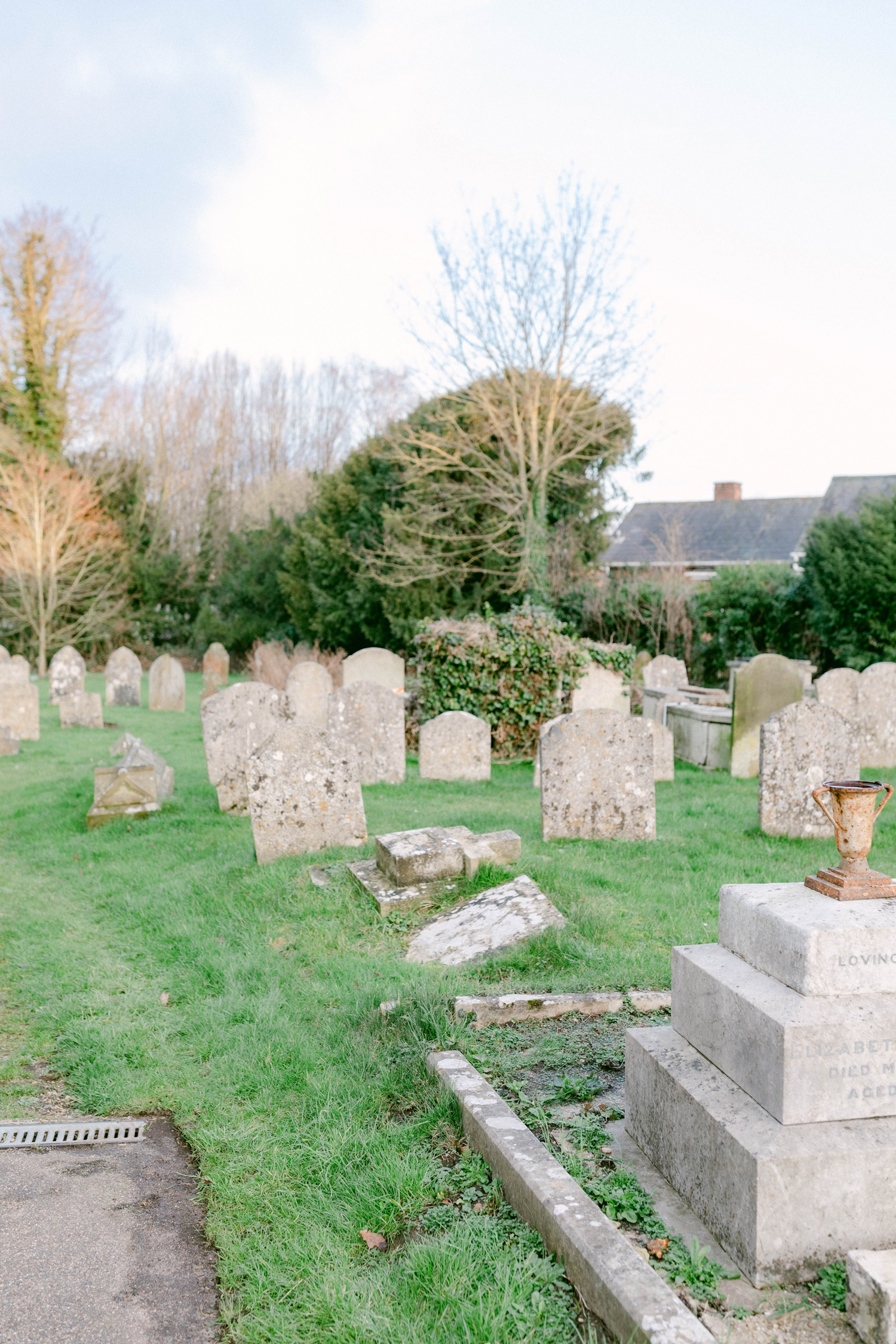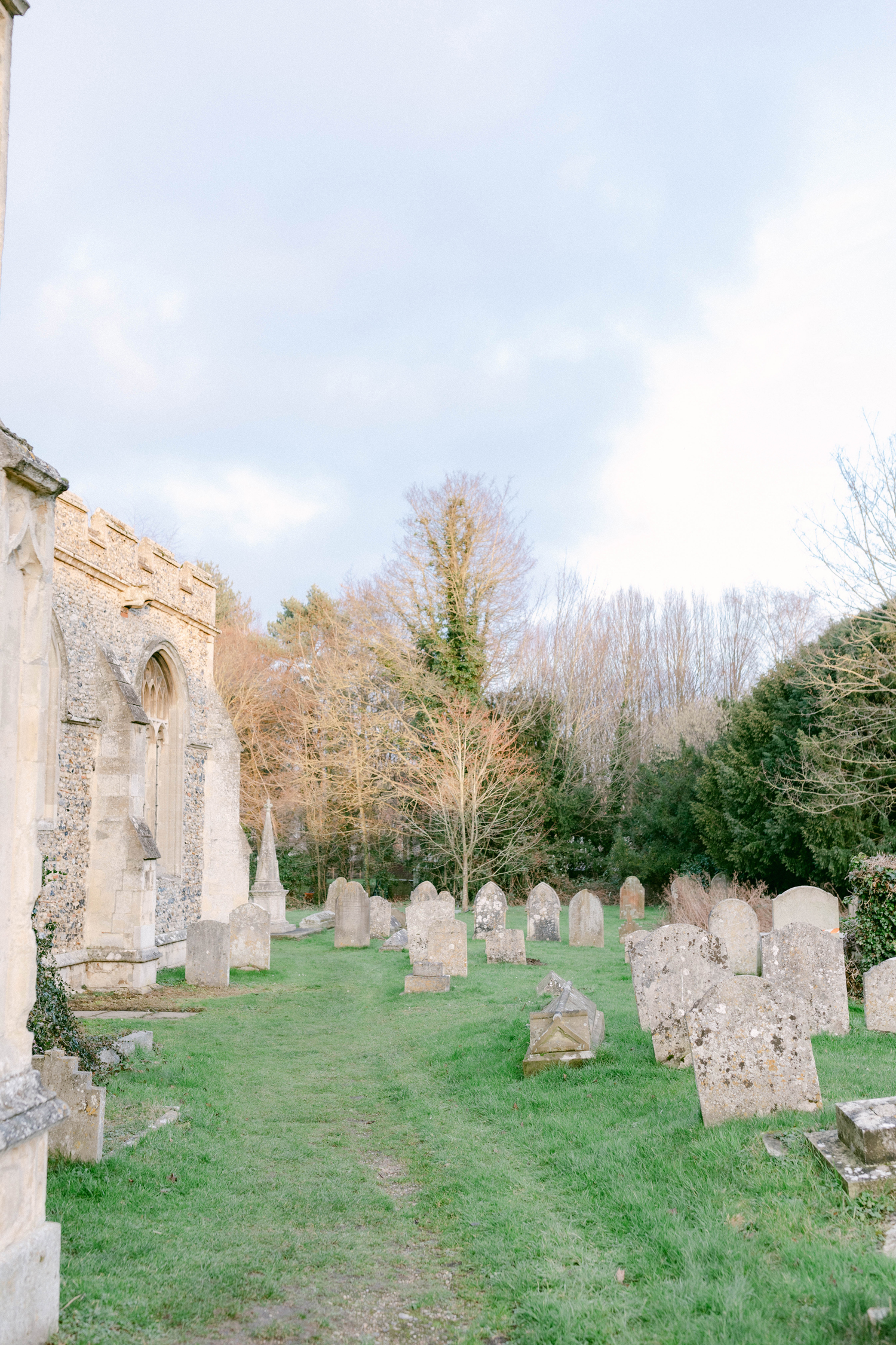 We parked on the side street and walked through town, toward the church. Boxford is a beautiful little village with a small population of only 833 people. It is a quinticential English country village. The homes here are the typical colorful yellows, pinks, and greens. They seem to all be made of brick or stucco. Rooftops are slate or wooden shakes. Some homes even have thatch roofs. It’s early February and the grass is green here. The atmosphere is a bit like that of the Pacific North West. The sky is blue, with a tinge of dark clouds in distance. It’s a bit chilly and wet, but the flowers are starting to bloom. Daffodilles and Forget-me-nots greeted us on our way through the village. Many of the cottages have plaques near their front doors with the cottage name. I feel as though I am in a storybook.