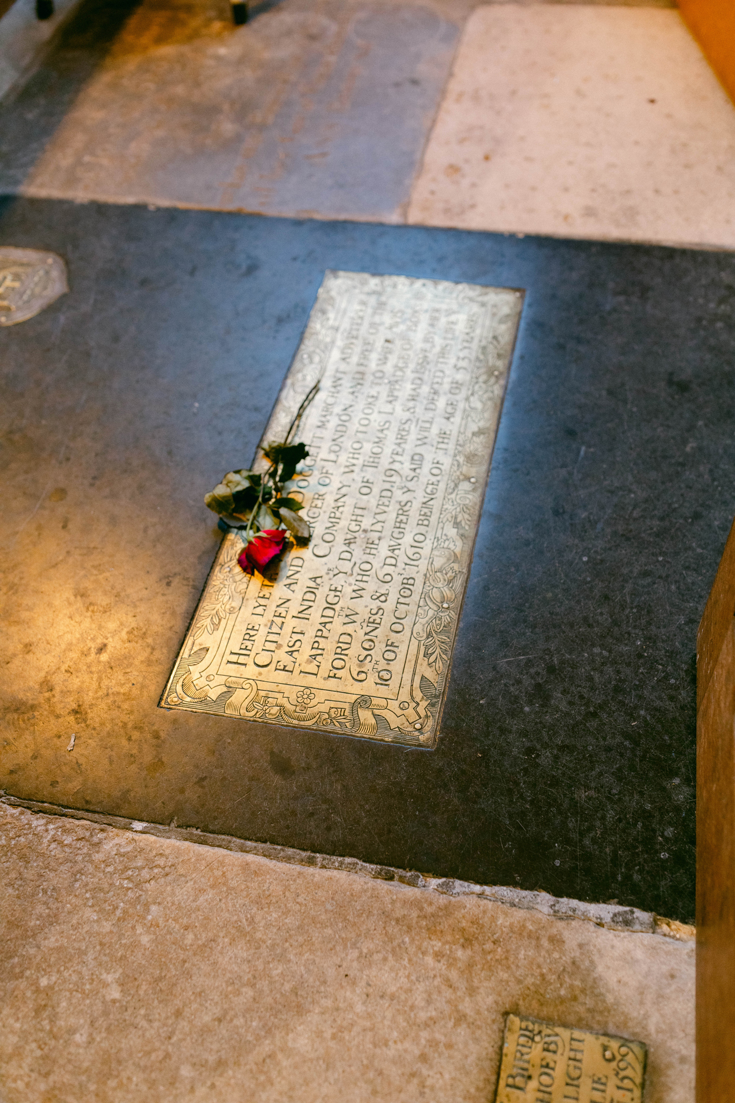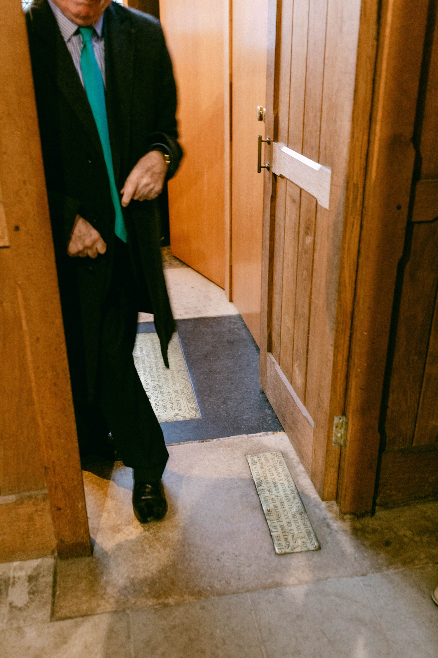 With goosebumps and emotions running high, I approched the door, looking down. There, preserved in stone with brass plaques, my Great Grandfather laid. I said to David, “I wish I had brought flowers.” Father Rob disappeared and came back with a red rose in hand. Almost teary eyed, I thanked him and walked inside the office. Standing over William’s grave I knelt down and placed the single red rose there. How long had it been since somone had paid their respects to him? To whom did he still matter? To me – he was the reason I had traveled nearly 4,000 miles, in search of a history that tied me directly to the Puritans who fled England under King James.
